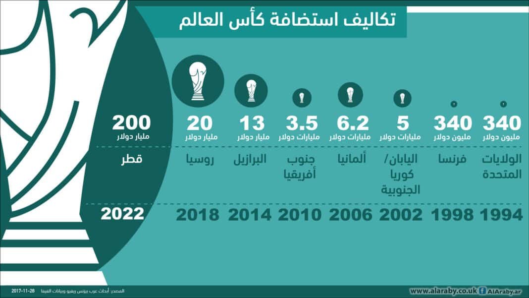 وفقًا لدراسة أقرتها لجنة قطر 2022 من المستحيل تحديد مدى استفادة قطر من استضافة كأس العالم أو أي حدث آخر، لكن من المتوقع أن تحقق مباراة المونديال 8 مليارات ريال قطري على الأقل (حوالي 2.2 مليار دولار) في الأرباح.