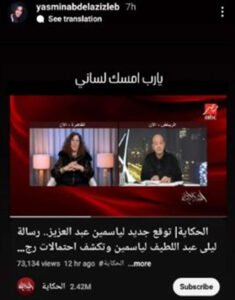 وقالت ليلى عبد اللطيف خلال استضافتها في برنامج “الحكاية”، الذي يقدمه الإعلامي عمرو أديب عبر قناة MBC مصر: “توقعي للفنانة ياسمين عبد العزيز إني لا أراها تستمر في حياتها لوحدها، وأشوفها في زواج وماسكة طفل أو طفلة في إيدها عندها في البيت، كيف العلم عند الله”.