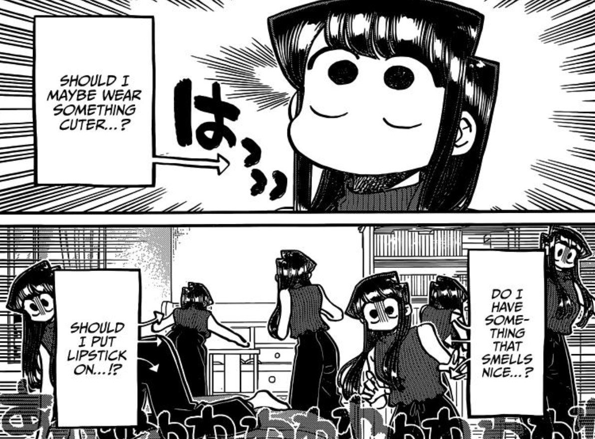 كان عنوان Komi Can’t Communicate الفصل 373 هو “الدراسة في المنزل”. افتتح الفصل مع كومي بإعداد جميع الملاحظات والكتب لجلسة دراسة شخصية مع تادانو. لكن هذه كانت مجرد خطة تم إسقاطها على السطح. في الواقع، كان هذا يوم تاريخ لكليهما. شعرت كومي بالتوتر، معتقدة أنها لا تبدو مناسبة لهذه المناسبة. ولكن قبل أن تتمكن من التغيير، كانت تادانو على عتبة بابها.
